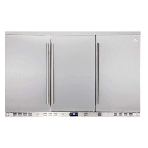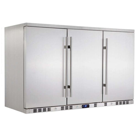 This full stainless steel outdoor beverage cooler with 3 doors is ideal for outdoor use. Its stylish appearance is matched by its outstanding performance, providing ample storage space while also maintaining a sleek design. Perfect for satisfying the thirst of friends in your backyard or customers on a rooftop patio, this refrigerator has a front-venting system that allows for convenient installation anywhere, even in outdoor spaces. No matter if you're creating a poolside kitchen or stocking a trendy nightclub, our product offers all the necessary features.