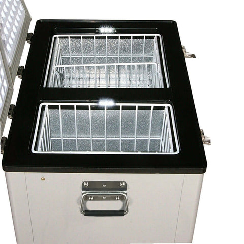 From the perspective of a product expert, the Whynter 62 Quart Dual Zone Portable Fridge/ Freezer offers premium quality and innovative design to meet all of your frozen and refrigerated needs. With two temperature zones, this unit allows for customizable refrigeration or freezing, making it ideal for any specific requirements. It can be powered by a standard household outlet or a 12 Volt source, such as a car battery. The internal LED lights provide easy access in low-light situations, making it perfect for day trips or longer expeditions. Unlike other 12 Volt coolers, this benchtop freezer is a true freezer and refrigerator, capable of cooling between -32°F and 50°F for frozen goods and between -8°F and 32°F for refrigerated items. This Whynter portable freezer is cost-effective and easily transportable, making it a reliable solution for all your freezing needs.